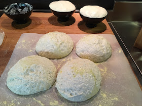 - Lasciare lieviatare sino alla triplicazione del volume (in estate 2 ore circa, se fa fresco mettere nel forno spento con le luci accese e un pentolino di acqua bollente dentro). Se la dimensione delle vostre ciotole è uguale a quella delle mie in foto, considerate che l'impasto è fuoriuscito dal limite, formando una cupoletta, come in questa foto ...