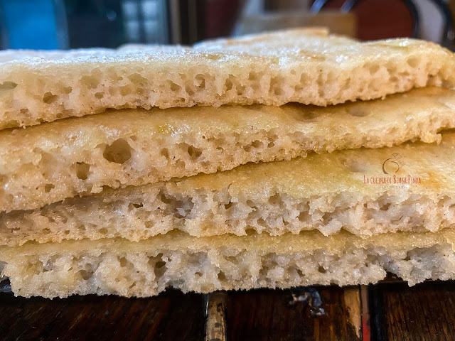 l'impasto, dopo la prima lievitazione in massa, è stato letteralmente versato dentro la leccarda ma buona parte dell'aria interna è rimasta all'interno ed è bene che ciò si verifichi, altrimenti tutta la prima lievitazione sarebbe stata inutile. Dopo circa un'oretta, a forno caldo, si è notato che l'impasto aveva ripreso a lievitare, di pochissimo ma è lievitato. Anche nel forno non crescerà moltissimo, direi quanto basta. La mollica infatti, come si vede in sezione, è tutta bollicine e molto leggera.